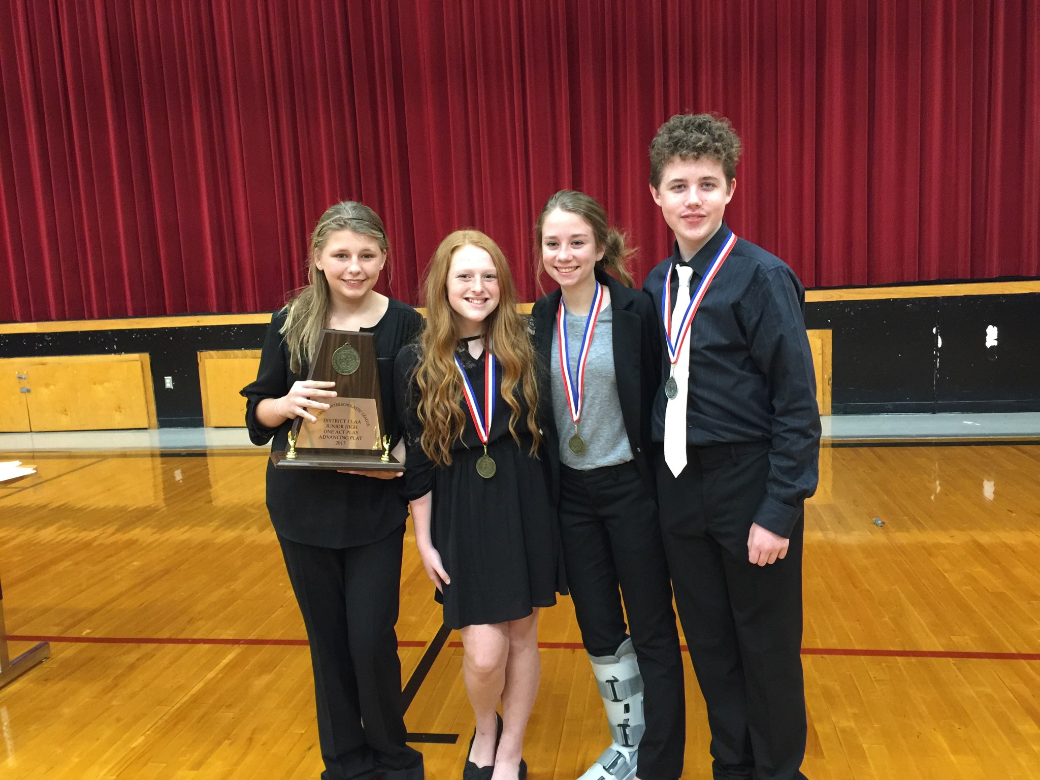 The Blue Ridge MS UIL Theatre company for the 3rd straight year won the UIL District Meet in Trenton on Saturday, December 2. The following BRMS students received special recognition after the OAP competition; Allie James (Best Actress), Gabi Avery (All Star Cast), Jake Tallant (Honorable Mention Cast), and Grace Hodges (Crew Award). Trenton last Saturday. Theatre teacher, Stacey Raymer did a fantastic job leading our students to an outstanding performance of the Miracle Worker.