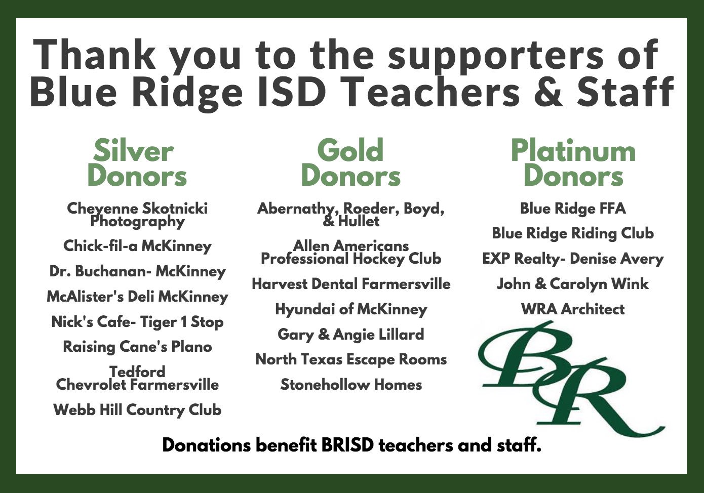 On the last day of school, we will continue our tradition of thanking our employees for their hard work this year. The board of trustees will be providing us with a fantastic lunch, and we will be thanking our teachers and staff in grand style. Below is a list of businesses and individuals who have donated prizes to reward our teachers and staff for their hard work this year. If you would like to be a part of group of donors, please contact Shawn Harris at 972-752-5554.